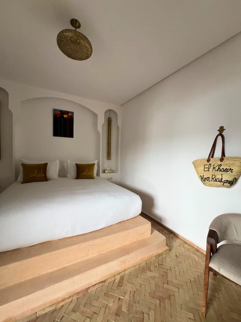 Découvrez la Chambre Kif-Kif, un cocon élégant situé au premier étage du Riad El Khaeir à Marrakech. Avec ses détails artisanaux, son ambiance chaleureuse et son mobilier soigneusement sélectionné, elle incarne à merveille le charme marocain revisité avec modernité.