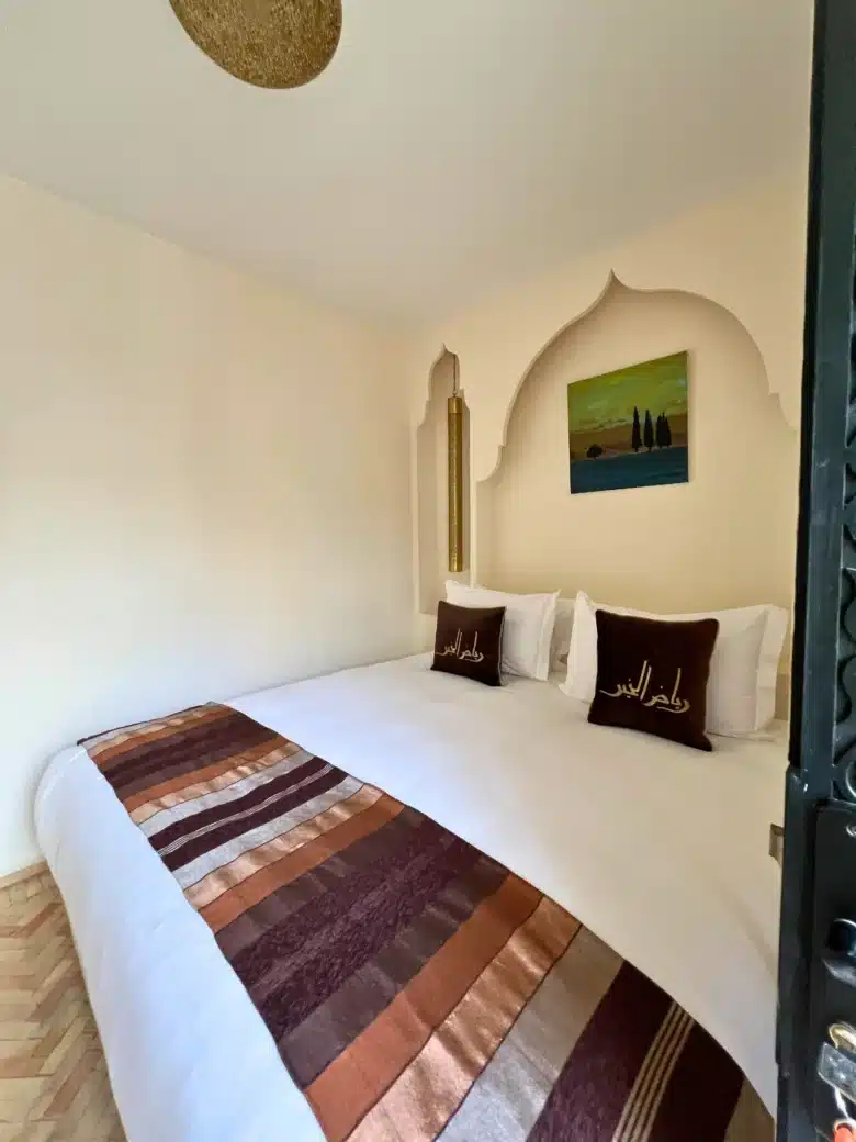Nid douillet au cœur du riad, la Chambre Secrète vous enveloppe d’une atmosphère feutrée et chaleureuse. Avec son confort haut de gamme et son charme intimiste, c’est le refuge parfait pour une escapade paisible à Marrakech. Un cocon idéal pour se ressourcer.